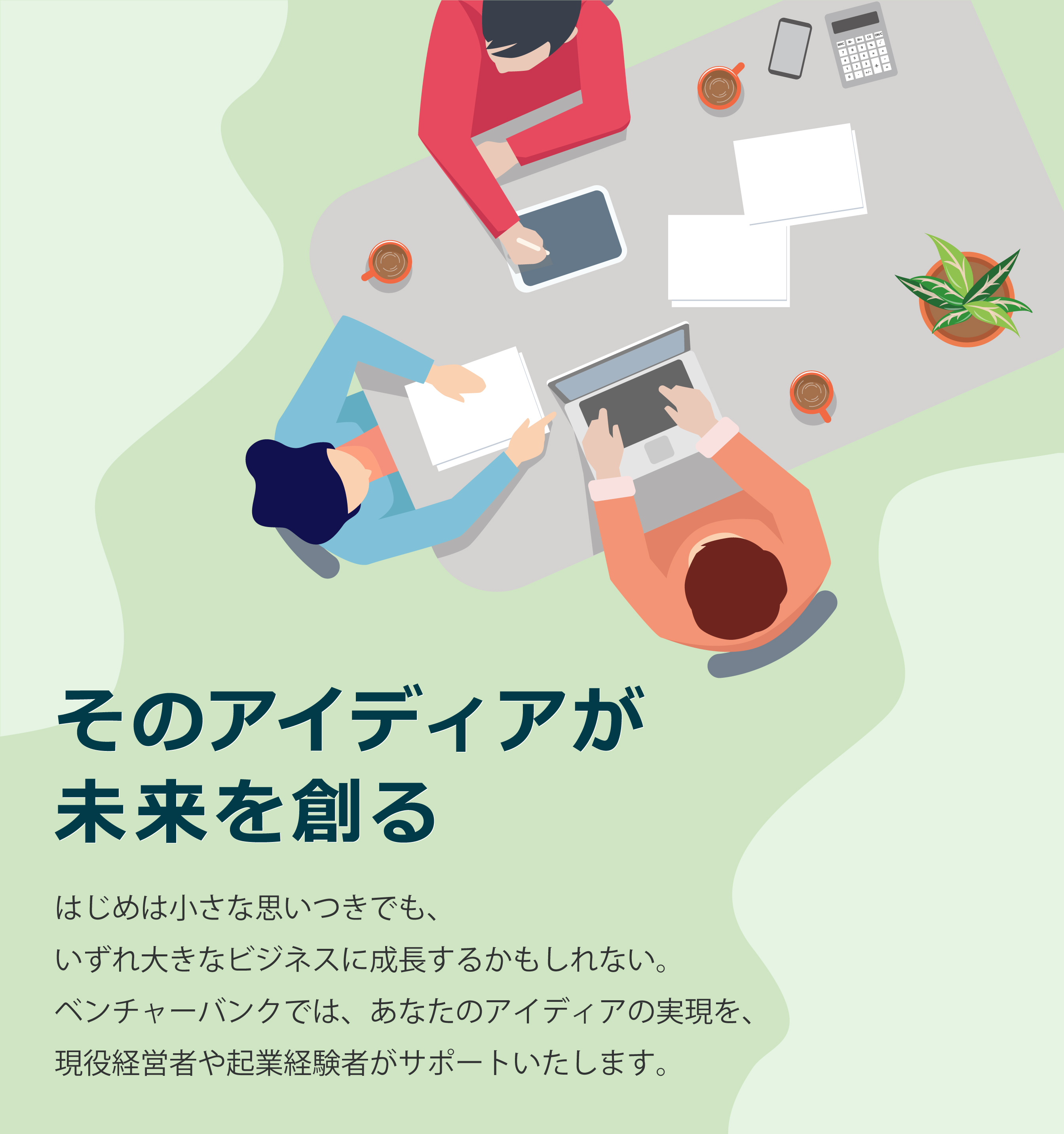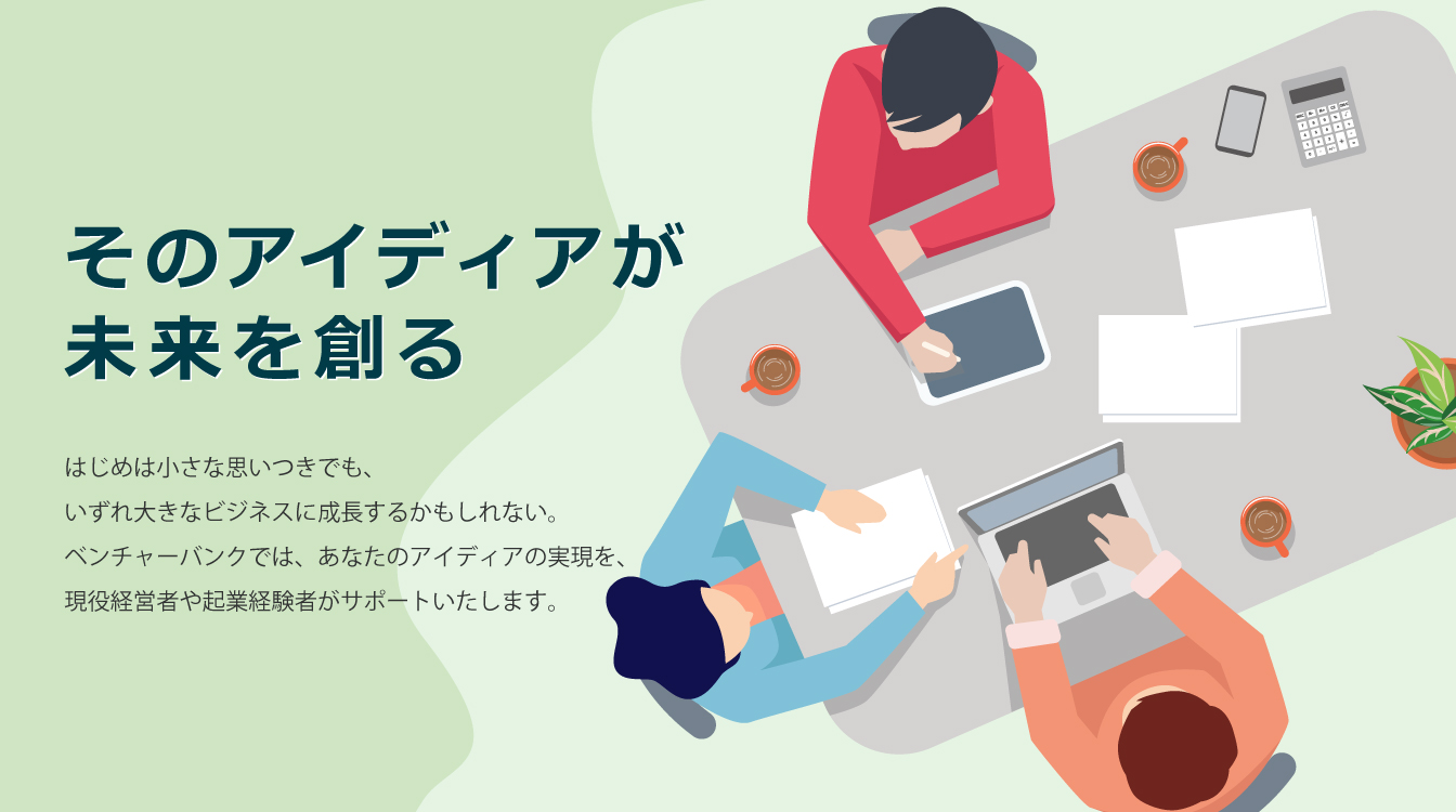 ベンチャーバンクを支える主要メンバーは、皆過去に起業し、様々な経験を経て、今の成功を手にしています。起業家を支援することができるのは起業経験者しかいないという考えのもと、様々なアドバイスやサポートを行っていきます。ベンチャーバンクは、言わば、起業家によって作られた起業家のための起業支援なのです。